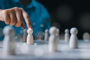 Businessman choosing wooden figure hiring, business tactics and strategy. Leadership of business success. Organization development. Personnel selection. Human resource management concept.