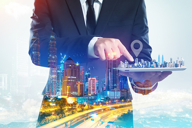 Success businessman using digital tablet show the home on virtual screen with night cityscape double exposure effect .