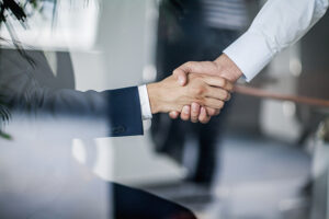Business handshake in glass reflection in office